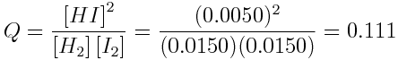 If [H2]=0.0150 mol L-1, according to the stoichiometry of the reaction, [I2] also drops to 0.0150 mol L-1 and [HI] increases to 0.0050 mol L-1. What is the reaction quotient, at this point in the reaction?
