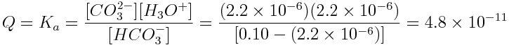 The chemical equation of the reaction shows tells us that if [H3O+] increased by 2.2×10-6 mol L-1, [CO32-] increased by the same amount and [HCO3-] decreased by this amount. Therefore, the equilibrium concentrations of these substances are: