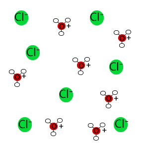 In solution, almost all the molecules of strong acids react. Based on this knowledge chemists can develop a molecular picture of strong acids. For example, because hydrochloric acid (HCl) is a strong acid, we picture HCl in solution not as units consisting of a hydrogen atom and a chlorine atom bonded together (H-Cl) but instead as separate chloride ions (Cl-) and hydronium ions (H3O+) in solution. The graphic below shows the ions that form when HCl is added to water. This is simplified by not showing the many water molecules that surround and aquate each of these ions.