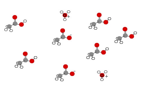 By contrast, very few of the acid molecules in solutions of weak acids are ionized. An example of a weak acid is acetic acid (CH3COOH). In solution, most acetic acid molecules remain as complete CH3COOH units. However, a few acid molecules ionize to form acetate ions (CH3COO-) and hydronium ions (H3O+). Notice that very few acetic acid molecules are ionized in the image below. Again, the many water molecules that surround each of the molecules and ions are not shown.