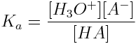 Based on the reaction scheme shown above, the general formula to determine the acid ionization constant, Ka, of the ionization of a weak acid in water at equilibrium is: