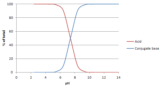 The effect of pH on the speciation of an acid or base can be displayed on a speciation plot. A speciation plot is a graph that shows the concentration of a certain acid and its conjugate base as pH changes. A sample speciation plot is shown below.