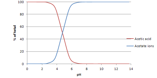 As mentioned previously, calculations of the ratio between an acid and its conjugate base are used to create speciation plots for the conjugate acid-base pair. Speciation plots graph the pH of the acid-base mixture against the percentage of the total species in solution that exist in the form of the acid or its conjugate base. Below is the speciation plot for acetic acid and acetate ions, plotted using the equation that describes weak acid-base equilibria. As the pH of the system changes, a greater percentage of acetate species exists in the form of acetate ions, rather than acetic acid.